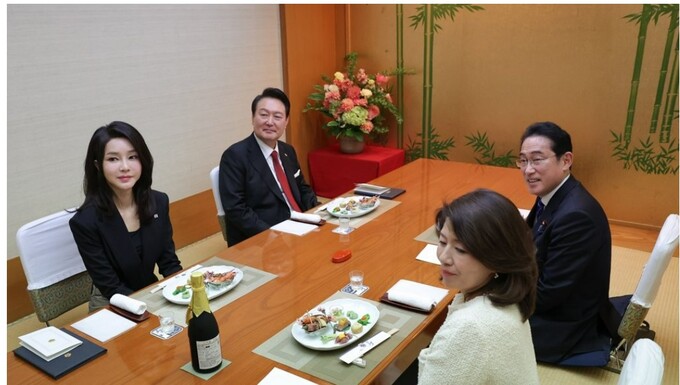윤석열 대통령(사진 왼쪽에서 두번째)과 기시다 후미오 일본 총리(〃 〃 세번째)는 16일 정상회담을 끝내고 도쿄 번화가인 긴자의 스키야키 식당에서 만찬을 함께 했다.