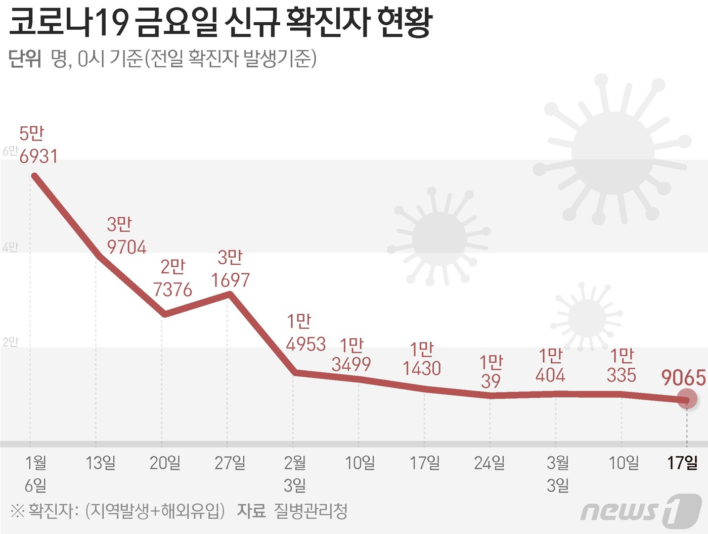 (서울=뉴스1) 윤주희 디자이너 = 질병관리청 중앙방역대책본부(방대본)는 17일 0시 기준 신종 코로나바이러스 감염증(코로나19) 신규 확진자가 9065명 발생했다고 밝혔다.