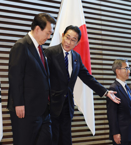 윤석열 대통령이 16일 오후 일본 도쿄 총리 관저에서 의장대 사열을 마친 뒤 일본측 인사를 만나기 위해 기시다 후미오 일본 총리의 안내를 받고 있다. (사진=연합뉴스) |