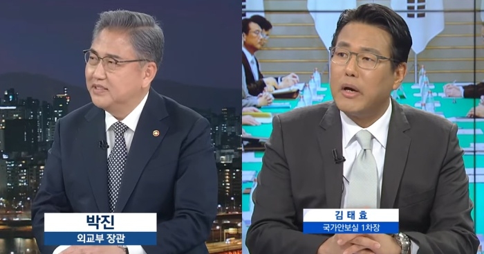 박진 외교부 장관(왼쪽)과 김태효 국가안보실 1차장이 지난 18일 각각 KBS와 YTN 방송 인터뷰에 출연해 발언하고 있다. KBS 및 YTN 뉴스 유튜브 영상 갈무리 |