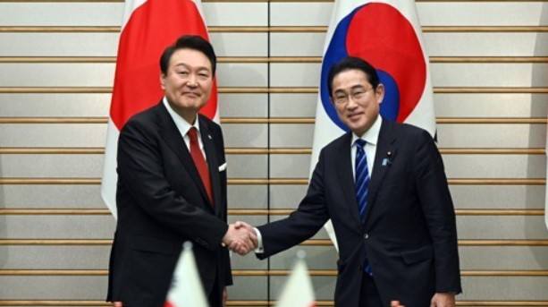윤석열 대통령과 기시다 후미오 일본 총리가 16일 오후 일본 도쿄 총리 관저에서 열린 한일 확대정상회담에 앞서 기념촬영을 하며 악수하고 있다. 연합뉴스 |