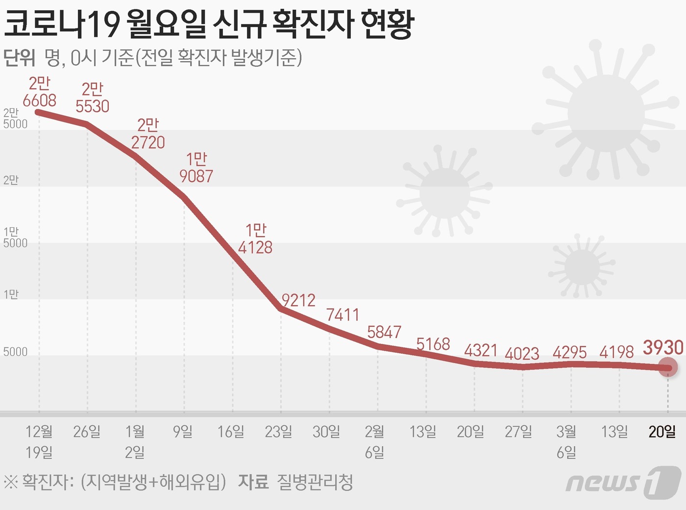 (서울=뉴스1) 김지영 디자이너 = 질병관리청 중앙방역대책본부(방대본)는 20일 0시 기준 신종 코로나바이러스 감염증(코로나19) 신규 확진자가 3930명 발생했다고 밝혔다.