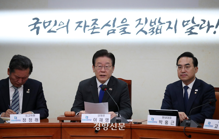 이재명 더불어민주당 대표(가운데)가 20일 국회에서 열린 최고위원회의에서 발언하고 있다. 박민규 선임기자 |