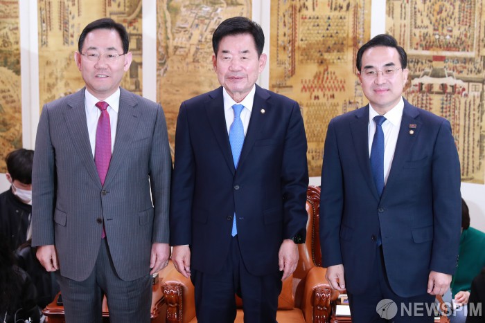 주호영 국민의힘 원내대표는 김진표 국회의장과 박홍근 더불어민주당 원내대표와 20일 오후 국회의장실에서 만나 양곡관리법, 정치개혁 등을 논의했다.