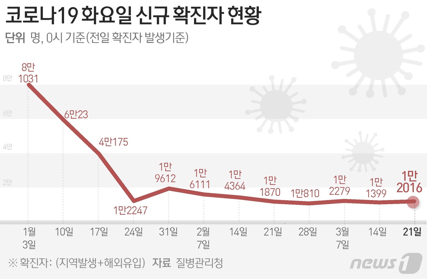 (서울=뉴스1) 김초희 디자이너 = 질병관리청 중앙방역대책본부(방대본)는 21일 0시 기준 신종 코로나바이러스 감염증(코로나19) 신규 확진자가 1만2016명 발생했다고 밝혔다.