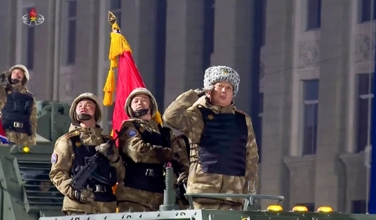지난 8일 북한 평양 김일성광장에서 열린 조선인민군 창건 75주년 열병식에서 ‘미사일총국’ 마크를 단 군인들이 정렬해 있다. 2023.2.8 조선중앙TV |