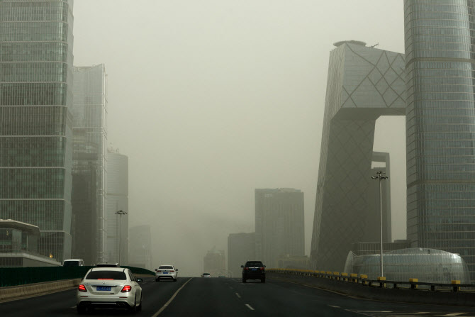 22일 베이징 현지에는 가시거리가 제한되고 하늘을 보기 힘들 정도로 황사가 극심한 상태다. 고층 건물 윤곽이 흐릿할 정도로, 시민들은 대부분 마스크를 챙겨 썼다.