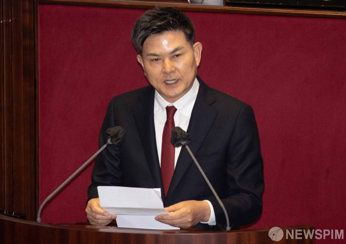 [서울=뉴스핌] 윤창빈 기자 = 김태호 국회 외교통일위원회 위원장이 14일 오전 서울 여의도 국회에서 열린 본회의에서 튀르키예-시리아 지진 피해 희생자 추모 및 복구 지원 결의안에 대한 제안설명을 하고 있다. 2023.02.14 pangbin@newspim.com |