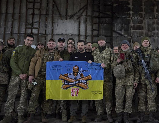 바흐무트 찾은 젤렌스키 22일 볼로디미르 젤렌스키 우크라이나 대통령이 러시아와 격전을 벌이고 있는 도네츠크 지역의 바흐무트를 방문해 자국 병사들과 군부대 깃발을 들고 사진을 촬영하고 있다. 바흐무트=AP 뉴시스 |