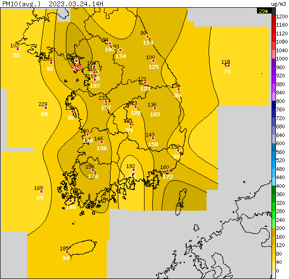 기상청은 24일 오후 서울을 포함한 전국에서 황사가 관측되고 있다고 밝혔다. 오후 2시 현재 1시간 평균 미세먼지 농도는 강화 200㎍/㎥, 서울 187㎍/㎥, 북춘천 134㎍/㎥, 속초 124㎍/㎥, 서청주 221㎍/㎥, 구덕산(부산) 172㎍/㎥ 광주 170㎍/㎥, 제주 고산 94㎍/㎥ 등이다.