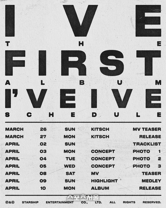 스케줄러에 따르면 아이브는 오는 26일 프리 릴리즈 곡인 ‘Kitsch(키치)’ 뮤직비디오 티저를 공개한 이후, 27일 ‘Kitsch’를 전격 발매하며 컴백 예열에 나선다. 신보 ‘I’ve IVE’의 4월 10일 발매 일정에 맞춰 2일에는 트랙리스트를 공개하고, 3일부터 5일까지는 콘셉트 포토를 공개한다. 또 8일 타이틀곡 뮤직비디오 티저, 9일 하이라이트 메들리를 선보이며 컴백 열기를 끌어올린다.