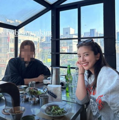 공개된 사진 속 손담비는 남편 이규혁, 지인과 함께 식당에 방문한 모습. 남심을 저격하는 꽃미소를 발산해 시선을 사로잡는다.
