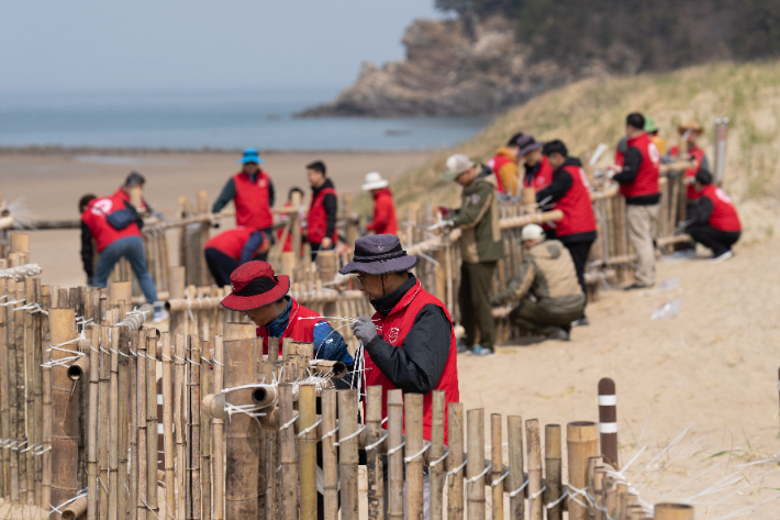기후변화로 인한 해수면 상승으로 해안 사구 침식 속도가 빨라지고 있어 모래 유실을 막기위한 모래포집기 설치 작업을 하는 겁니다.