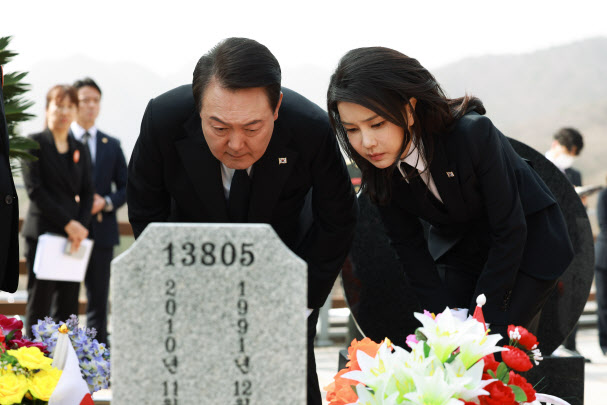 윤석열 대통령과 김건희 여사가 24일 대전 유성구 국립대전현충원에서 열린 제8회 서해수호의 날 기념식에 앞서 제2연평해전 및 연평도 포격전 전사자 묘역을 참배하고 있다.(사진=대통령실 제공) |