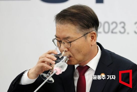 이정식 고용노동부 장관이 28일 서울 중구 프레스센터에서 열린 경제5단체와의 간담회의 참석, 간담회 도중 갈증이 나는 듯 물을 마시고 있다. 사진=윤동주 기자 doso7@ |