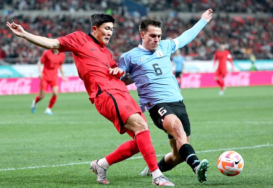 클린스만 감독으로 사령탑을 교체한 축구대표팀은 다이내믹한 공격과 달리 수비에서 2경기 4실점하며 약점을 노출했다. 28일 우루과이 선수를 방어하는 수비수 김민재(왼쪽). [연합뉴스] |