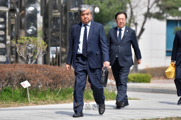 영장 심사에 출석한 한상혁 방통위원장 - TV조선 재승인 심사와 관련해 구속영장이 청구된 한상혁 방송통신위원장이 29일 오후 서울북부지법에서 열린 구속 전 피의자 심문(영장실질심사)을 받기 위해 청사 안으로 들어서고 있다. 2023.3.29 홍윤기 기자 |
