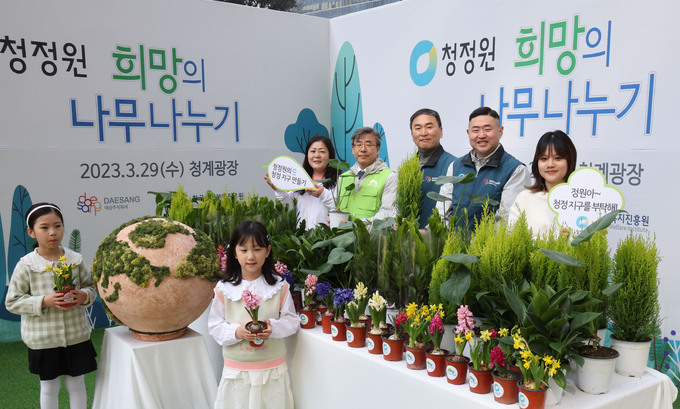 29일 서울 종로구 청계광장에서 대상(주)과 한국산림복지진흥원 주최로 열린 '2023 청정원 희망의 나무 나누기' 행사에서 임정배 대상 대표이사, 남태헌 한국산림복지진흥원장 등이 공기정화식물 나눔 시연을 하고 있다. 이번 행사는 식목일을 앞두고 산림에 대한 소중함과 저탄소 녹색성장에 대한 관심을 제고하기 위해 열렸다.