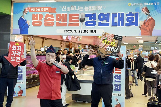 농협유통·농협하나로유통(대표이사 신영호)은 28일 서울 서초구 소재 농협 하나로마트 양재점에서 우리나라 최고의 방송 멘트 전문가 10인을 선정했다. 방송 멘트 마케팅 전문가 경연대회 장면 |