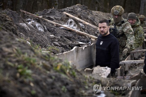참호를 둘러보는 젤렌스키 우크라 대통령 |