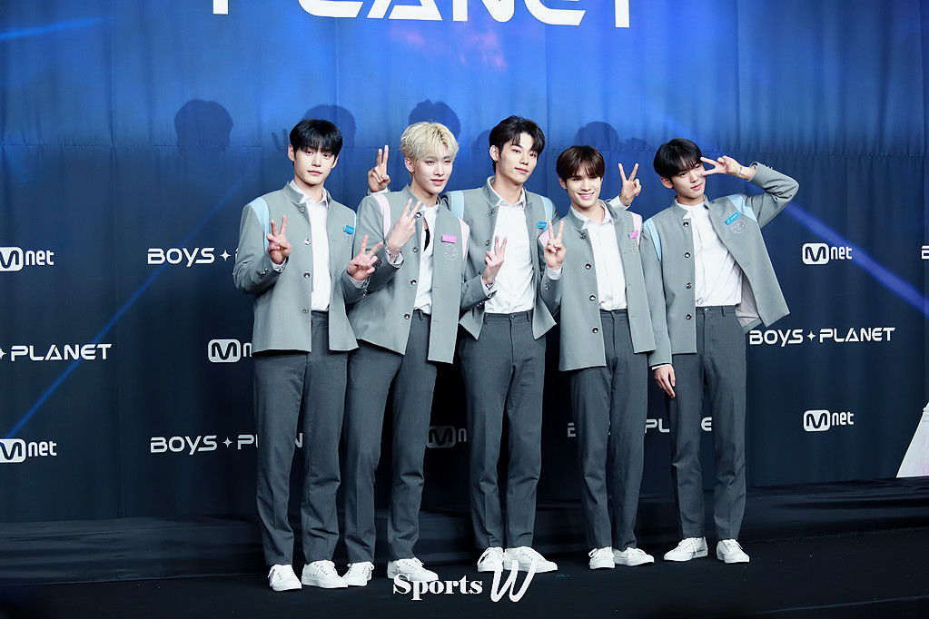 29일 오후 1시 30분 서울 마포구 상암 CJ ENM에서 엠넷 오디션 프로그램 '보이즈 플래닛' 생존자 신고식에서 2조 김지웅 리키 이정현 제이 한유진이 포즈를 취하고 있다.
