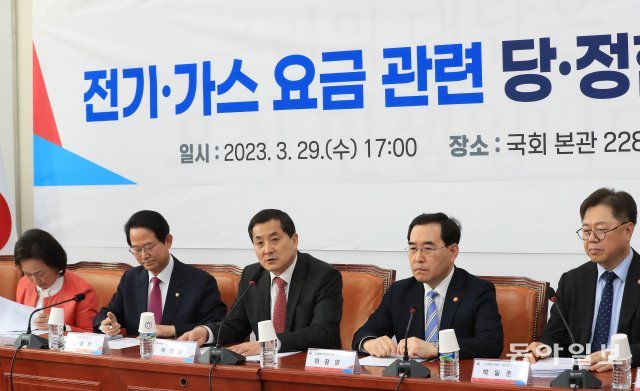 당정은 29일 국회에서 전기·가스 요금 관련 당정협의회를 열고 전기·가스 요금 인상에 대해 논의했다. 협의회에는 국민의힘 박대출 정책위의장과 이창양 산업통상자원부 장관 등이 참석했다. 이날 정책위의장 취임 후 처음으로 당정협의회를 주재한 박 의장은 협의회 종료 후 브리핑에서 “한국전력의 경우 하루 이자 부담만 38억 원 이상이 소요되고, 가스공사의 경우 하루 이자 부담이 13억 원 이상”이라며 “이런 현실을 감안하면 전기·가스 요금 인상이 불가피하단 점에 당정 간 인식을 같이했다”고 밝혔다.