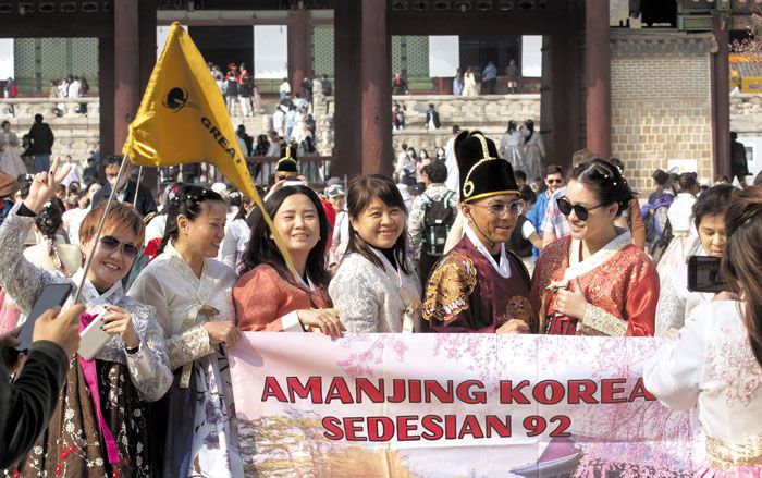 18세 이하 외국인, 무료로 궁궐 관람 - 29일 한복을 입은 외국인들이 서울 종로구 경복궁을 단체 관광하고 있다. 이날 문화재청은 만 18세 이하 외국인 청소년이 다음 달부터 주요 궁궐을 무료로 관람할 수 있게 하겠다고 했다. 현재 내국인의 경우 만 24세 이하, 만 65세 이상이 무료로 관람하고 있다. /박상훈 기자 |