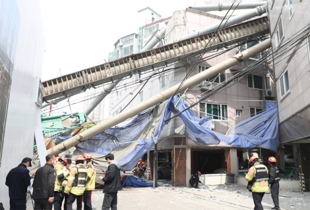 29일 오전 울산 남구 신정동의 한 주상복합아파트 공사 현장에서 쇠말뚝 등을 땅에 박는 37m 길이의 토목기계 항타기가 쓰러지면서 인근 원룸 건물을 덮쳤다. 이 사고로 건물 내부에 있던 주민 등 5명이 부상해 병원으로 옮겨졌지만 생명에는 지장이 없는 것으로 알려졌다.