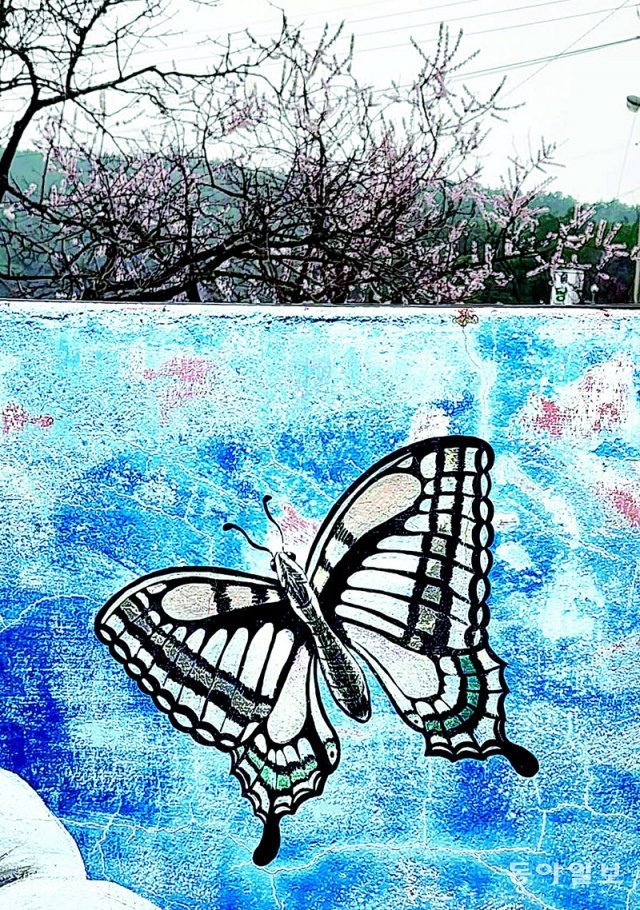 담장 너머로 만개한 벚꽃이 보고 싶은 걸까요. 벽화 속 나비가 금방이라도 하늘로 날아오를 것 같네요.