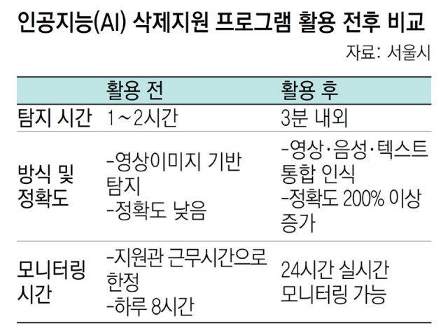 시 관계자는 “키워드 입력 후 영상물을 찾기까지 기존에는 1, 2시간 걸렸는데 새 시스템을 활용하면 3분 만에 가능하다”며 “검색 및 삭제 담당자들이 피해 영상물을 접하면서 트라우마가 생기는 것도 막을 수 있다”고 했다.