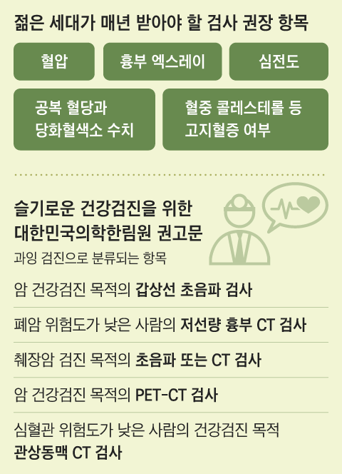 정승은 가톨릭대 은평성모병원 영상의학과 교수는 “직장 검진을 통해 20~30대 여성들이 유방암 찾는 유방 촬영술을 받는 경우가 상당수인데, 젊은 나이 유방 방사선 검사는 되레 유방암 발생을 높일 수 있기에 해서는 안 된다”고 말했다. 국립암센터는 유방암 가족력이나 유전적 돌연변이가 없는 경우, 40세 이상부터 유방 촬영술 검진을 권장한다. 정승은 교수는 “증상이 없는 40대 남자의 전립선 초음파 검사, 40대 이하 비흡연자의 저선량 폐 CT 검사도 낭비적인 검진”이라며 “건강검진 결과를 진료와 질병 관리 교육에 활용할 수 있는 제도가 필요하다”고 말했다.