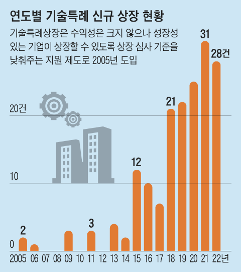 기술특례 상장이란 수익성은 낮지만 성장성이 큰 기업들이 상장할 수 있도록 상장 심사 기준을 낮춰주는 지원 제도다. 2005년 도입됐다.