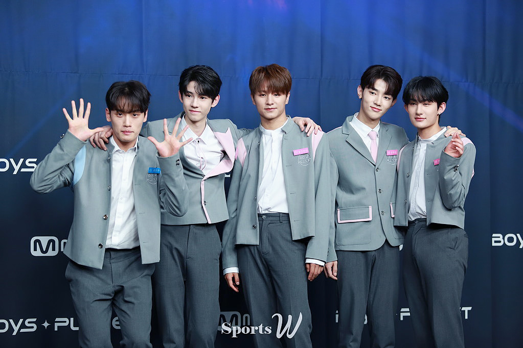 29일 오후 1시 30분 서울 마포구 상암 CJ ENM에서 엠넷 오디션 프로그램 '보이즈 플래닛' 생존자 신고식에서 4조 금준현 올리 왕즈하오 장하오 하루토가 포즈를 취하고 있다.
