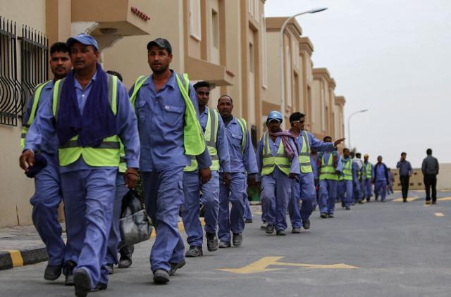2015년 카타르 수도 도하에서 '2022 카타르 월드컵'을 위한 축구 경기장 건설에 동원된 이주노동자들이 일을 마친 뒤 줄지어 귀가하고 있다. 도하=AFP 연합뉴스 |