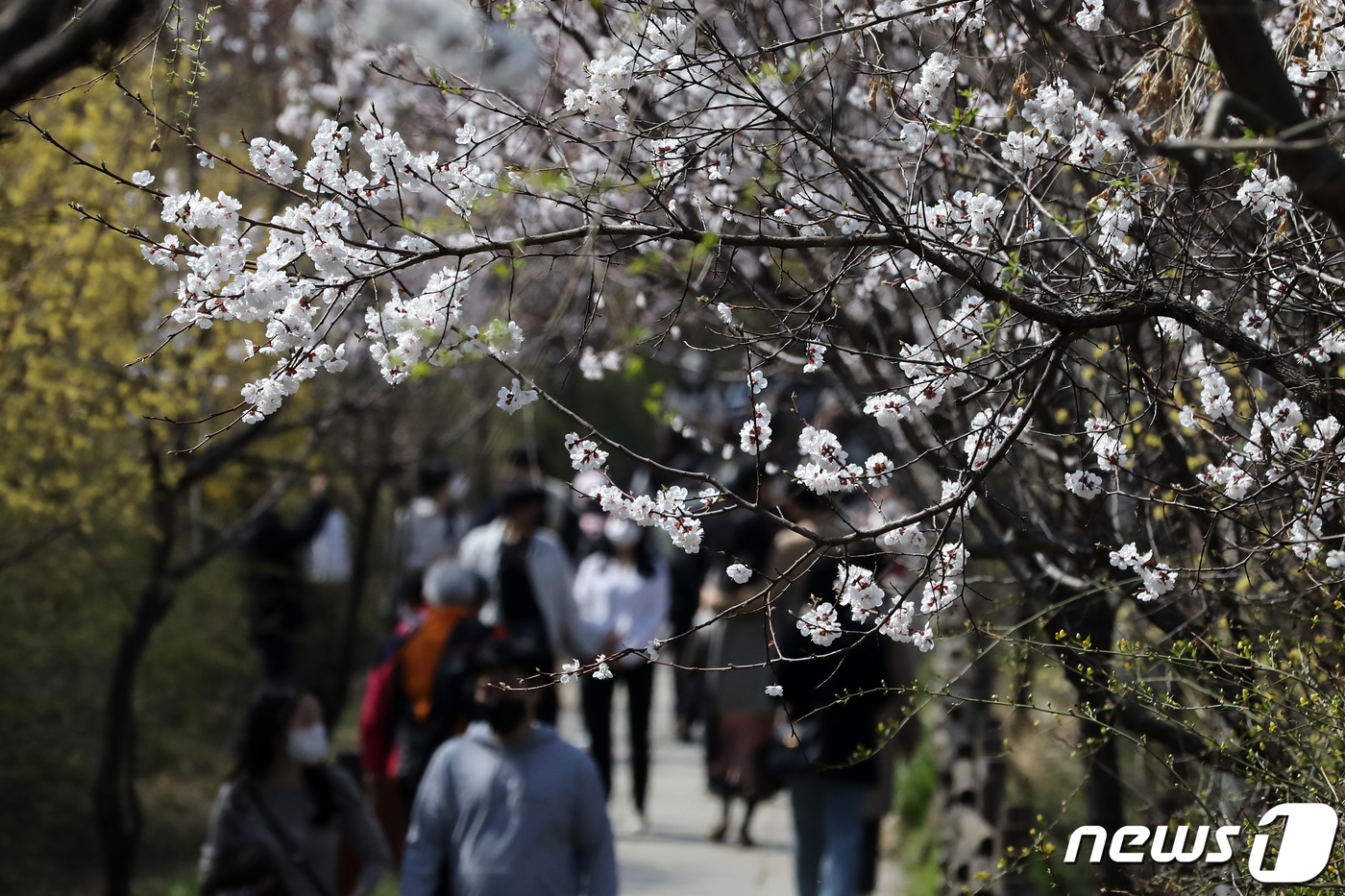 전국적으로 일교차가 큰 봄날씨를 보인 3일 오후 서울 여의도 한강공원을 찾은 시민들이 봄꽃들을 보며 거닐고 있다. 2022.4.3/뉴스1 ⓒ News1 이승배 기자 |
