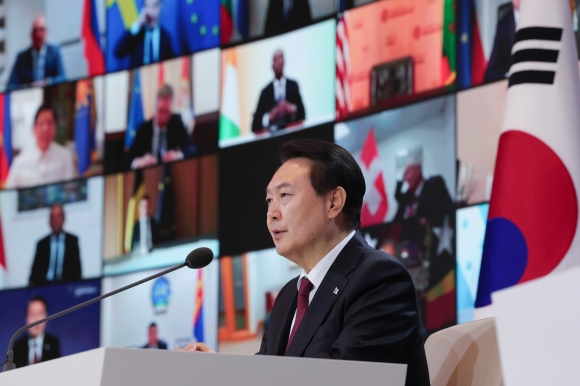 윤 대통령은 “규범 기반의 국제 질서를 정면으로 부인하는 권위주의 세력들의 진영화에 더해 반지성주의로 대표되는 가짜 민주주의가 전 세계적으로 고개를 들고 있다”며 “우리는 각고의 혁신과 연대를 통해 후퇴하는 민주주의를 되살리는 새로운 여정을 시작해야 한다”고 강조했다.