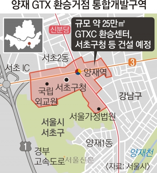 서울시가 서초구 양재역 일대를 수도권광역급행철도(GTX) 환승시설을 중심으로 한 입체복합도시로 만들기 위한 준비작업에 들어간다.