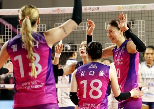흥국생명 김연경(오른쪽)이 29일 한국도로공사를 상대로 인천 삼산월드체육관에서 펼친 프로배구 V리그 여자부 챔피언결정전 1차전 세 번째 세트에서 득점한 뒤 외국인 선수 옐레나(왼쪽)를 비롯한 동료들과 하이파이브를 하며 기뻐하고 있다. 연합뉴스 |