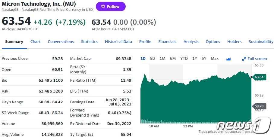 29일(현지시간) 뉴욕증시에서 마이크론은 전거래일보다 7.19% 급등한 63.54 달러를 기록했다.