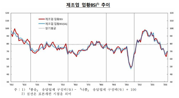BSI는 기업의 현재 기업 경영 상황에 관한 판단과 전망을 조사한 수치로 기업의 체감경기를 알 수 있다. 지수가 100이 넘으면 업황이 좋다고 응답한 기업이, 100보다 작으면 업황이 나쁘다는 기업이 더 많다는 뜻이다. 2003년 통계 작성 이후 전산업 BSI가 100을 넘은 적은 한 번도 없다. 지난해 9월 하락 전환한 이후 6개월 연속 악화했으나 이달 들어 개선되고 있다. 전산업 BSI가 70으로 올라선 것도 3개월 만이다.