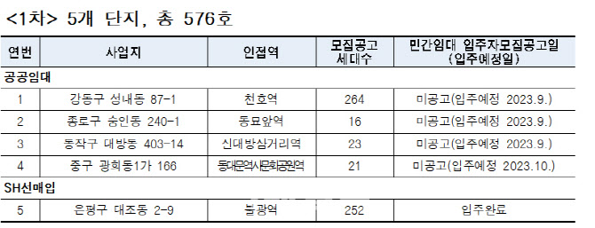 이번 입주자 모집은 강동구 성내동 87-1 일원 역세권청년주택 264호를 비롯해 5개단지 총 576호를 공급할 예정이며, 최종 당첨된 입주자는 입주자격 확인 등을 거쳐 2023년 9월 이후 입주하게 된다.