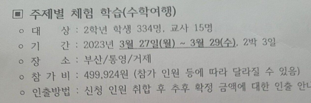 학교 측도 수학여행이 달갑지 않기는 마찬가지인 상황이다. 물가 영향으로 경비 상승이 불가피한 데 학생과 학부모들의 입장이 갈리기 때문이다. 일부 학생과 학부모들은 학창 시절 추억을 남겨야 한다며 수학여행을 꼭 가야 한다고 주장하지만 반대 측에선 굳이 비싼 비용을 부담하고 싶지 않다는 식이다.