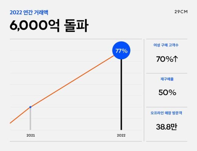 무신사가 운영하는 29CM는 지난 1월 2022년 연간 거래액이 전년 대비 80% 신장한 6000억원을 돌파했다고 밝혔다.