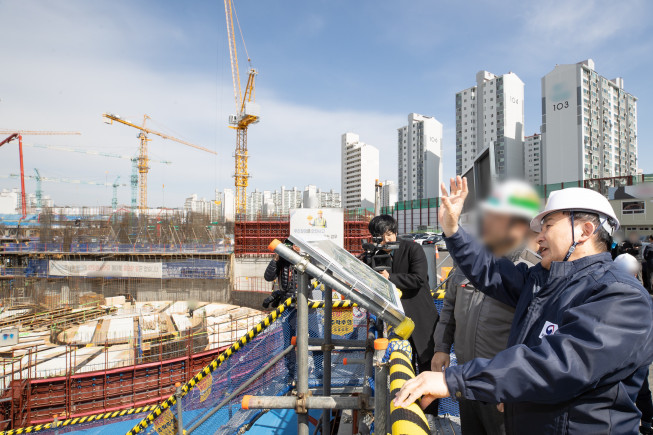 원희룡(오른쪽) 국토교통부 장관이 14일 서울 한 공사현장을 찾아 타워크레인 운행 상황을 점검하고 있다. |