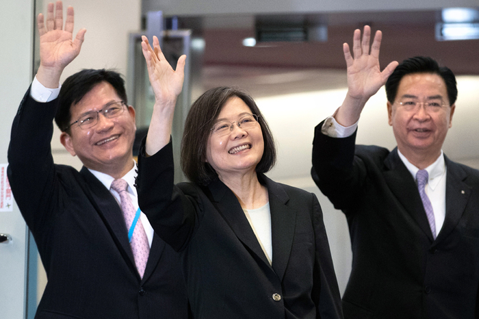 미 중 충돌이 다시 격화하는 가운데 차이잉원 대만 총통 (가운데) 이 린자룽 총통 비서실장 (왼쪽), 우자오세 외교부장과 함께 29일 출국을 위해 타오위안 국제공항에서 손을 흔들고 있다. 차이 총통은 9박 10일 일정으로 중미 과테말라와 벨리즈를 방문하는 과정에서 뉴욕과 로스엔젤레스를 경유한다. 중국정부는 차이 총통이 미국을 경유하며 케빈 메카시 미 하원의장과 만날 경우 ‘결연한 반격’을 하겠다고 경고했다. /사진=EPA연합뉴스 |