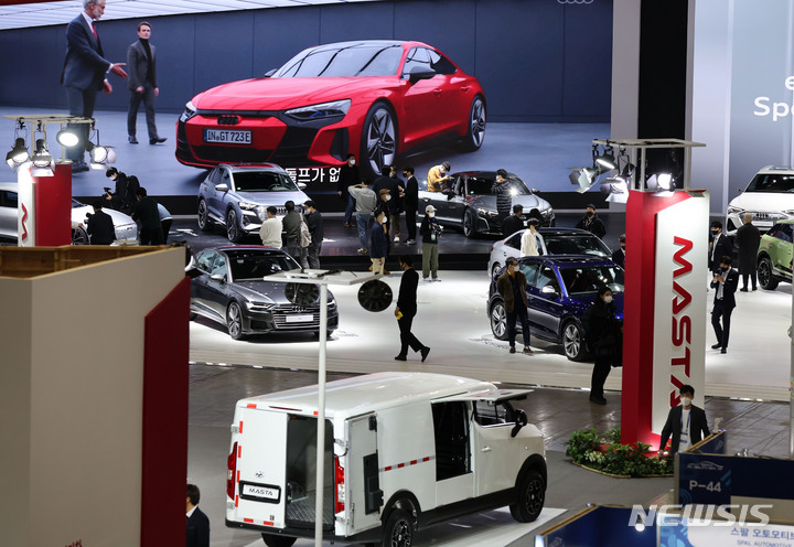 [고양=뉴시스] 고범준 기자 = 26일 오전 경기 고양시 일산서구 킨텍스 제2전시장에서 열린 2021 서울모빌리티쇼 개막식에서 관람객들이 전시된 차량들을 살펴보고 있다. 2021.11.26. bjko@newsis.com |