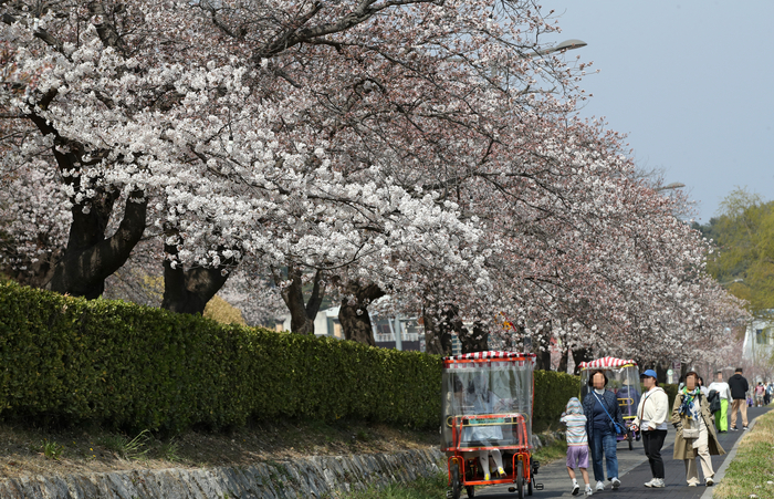 29일 강원 강릉시 경포대 일원에 벚꽃이 활짝 펴 시민과 관광객의 발길이 이어지고 있다. 연합뉴스 |