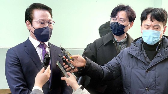 최경식(왼쪽) 남원시장이 지난 1월 19일 전주지법 남원지원에서 재판을 마치고 취재진 질문에 답하고 있다. 최 시장은 이날 공직선거법 위반 혐의(허위사실공표)로 벌금 80만원을 선고받아 직위를 유지할 수 있게 됐다. 연합뉴스 |