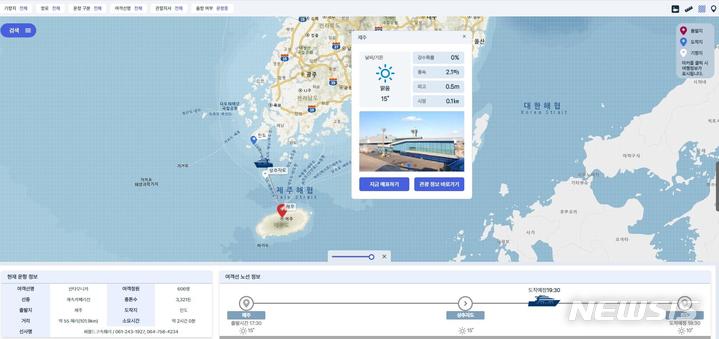 [서울=뉴시스] 해양교통안전정보시스템(MTIS)에서 제공하는 '여객선 교통정보 서비스(PATIS)'에서 제주-여객선 항로 여객선을 조회한 모습. |