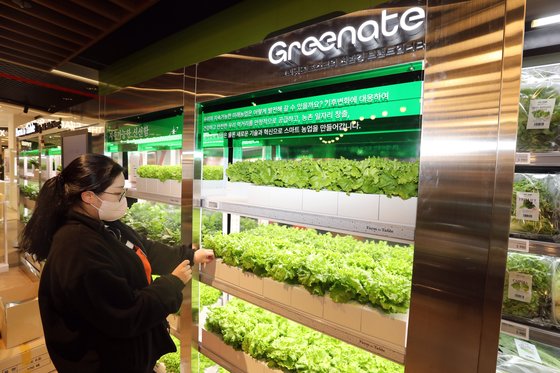 이마트가 30일 '미래형 대형마트'를 표방하며 문을 연 인천 연수점 모습. 스마트팜 기업 엔씽과 연계해 매장에서 채소 4종을 재배하고 고객이 직접 보며 수확한 상품을 살 수 있게 했다. 사진 이마트 |